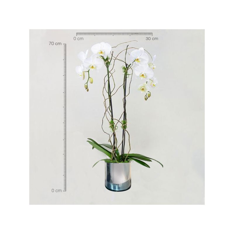 Orquídea Phalaenopsis premium blanca de 2 tallos en base de vidrio plateada.